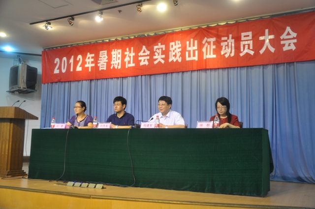 7月3日下午,我院2012年大学生暑期 "三下乡"社会实践活动出征仪式在现代教育技术楼二楼报告厅隆重举行,院党委副书记、副院长程建军出席并讲话。学工处、教务处、团委等相关部门负责同志,各院系学生工作负责人、团总支书记,各社会实践团队指导老师及社会实践队员百余人参加会议,会议由团委副书记刘莹主持。