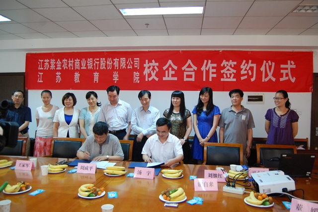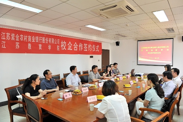 6月12日下午,江苏紫金农村商业银行股份有限公司党委书记解自来、副行长汤宇、人事处处长吴亚萍、党群部长郭雪红等一行五人来我院,就共建"紫金银行艺术团"签署校企合作协议。我院常务副院长周成平出席会议,党办院办主任王家军,人事处处长刘继红,音乐系主任马小歌、副主任周振亚,团委副书记刘莹参会。会议由刘继红主持。
