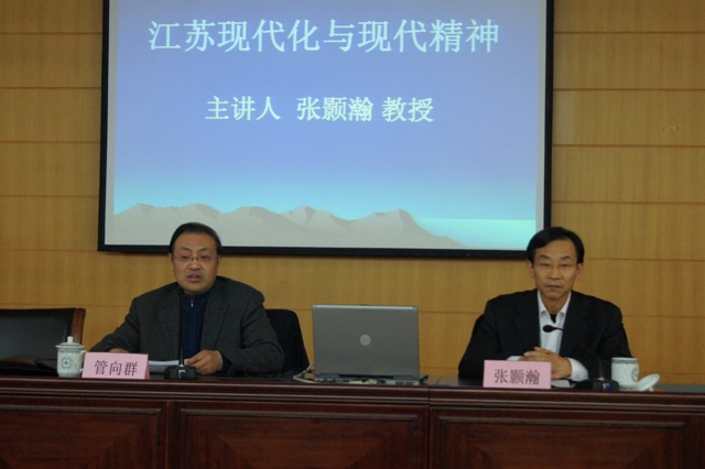 会议第二阶段,作为我院学术活动周的高水平学术报告会,同时也是科研推进会的主旨报告,省社科联党组书记、常务副主席张颢瀚教授为我院教师作了"江苏现代化与现代精神"的专题报告。报告从现代化由梦想到现实、由国际样本到中国蓝图、历史文化与新时期江苏精神3个方面,对省委十一届十二次全会和第十二次党代会关于文化建设和现代化建设的重大决策部署作了深刻解读。报告会气氛热烈。