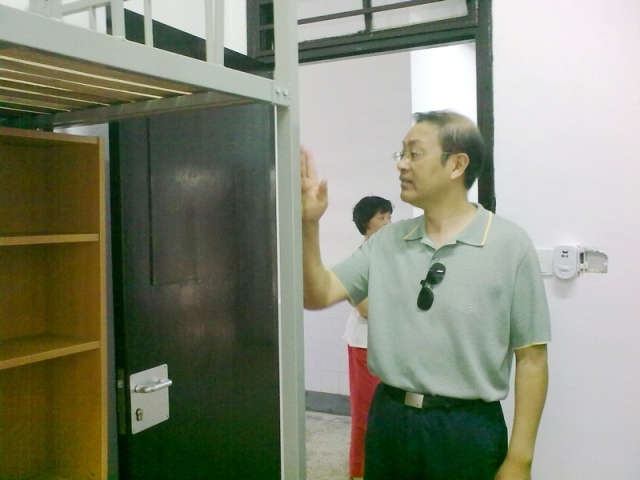 管书记和王院长重点查看了两幢新学生宿舍楼的改造情况,对新楼的土建、家具安装、网络铺设等工作进行了仔细检查,详细询问了两幢楼住宿方案的安排以及在新学期的管理等情况。两位领导仔细检查了两幢宿舍楼的每一层,对发现的问题要求相关部门及时解决。在4号楼的五楼,针对五楼三间相对条件较差的宿舍,管书记要求宿舍管理服务中心一切从学生利益出发,想方设法做好学生的住宿安排以及其他各类服务工作。管书记还详细询问了学生食堂的准备工作情况、新宿舍楼学生的洗澡情况等等。