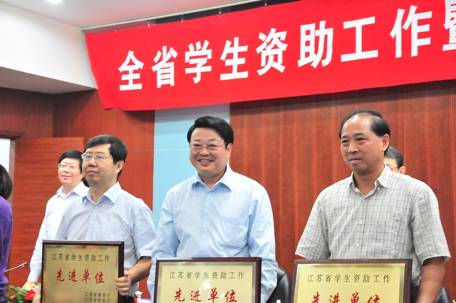 会上,我院被江苏省教育厅、江苏省财政厅授予"江苏省学生资助工作先进单位"荣誉称号,院党委副书记、副院长程建军作为获奖高校领导代表上台领奖。
