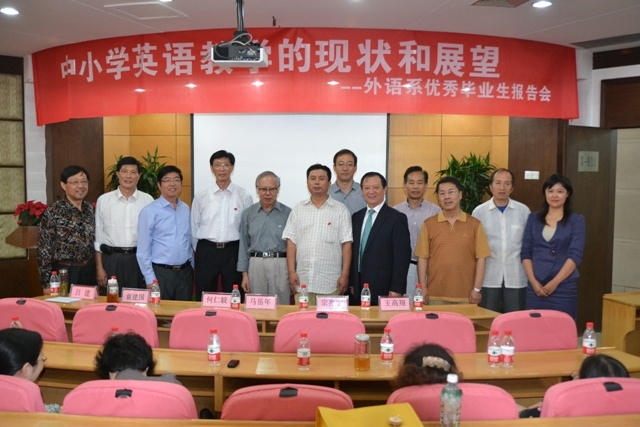 为庆祝学院60周年华诞,9月22日下午,外语系在现代教育技术大楼报告厅隆重举行了"中小学英语教学的现状与展望"优秀毕业生报告会。副院长王仁雷,外语系历任领导孙汉云、曹亚民,外语系历届杰出校友代表:海安高级中学校长、党委书记吕建,无锡市教育研究中心马岳年,海门市中小学教师研修中心何仁毅,南通市启秀中学袁建国,宝应中学副校长宗兆宏,南京师范大学附属中学江宁分校校长葛敏,保利协鑫能源控股有限公司副总裁王高翔等出席会议,外语系全体老师和全日制学生代表们参加会议。报告会由系副主任张莉主持。