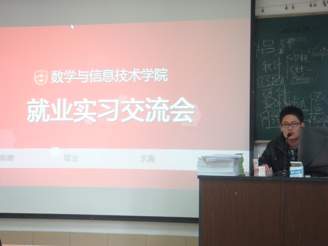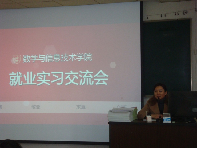 为帮助学生明确未来奋斗方向,把握当前就业形势,提前做好就业准备,2月18日上午,数学与信息技术学院在教二101教室举办了"就业实习交流会"。交流会邀请已成功专升本或已经工作的六位优秀学子介绍经验。副院长孙玫、班主任、辅导员以及09、10、11级计算机班学生参加交流会。大会由党总支副书记杨嵘主持。