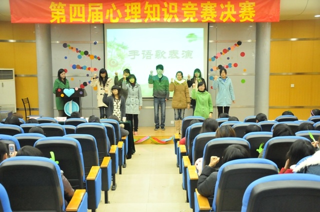 本次大赛设三个环节,第一环为必答题,主要是考验参赛选手对基础心理学知识的掌握情况;第二环为冒险抢分题,试题难度增加,在考查专业知识的同时,更是考验选手的心理素质和现场应变能力;第三环为情景题,选手通过视频或排演的情景剧,分析剧中人物可能存在的心理问题,并针对该问题提出自己的解决办法。选手的精彩解答赢得了大家的阵阵掌声,也给全场观众留下了深刻印象。心理健康协会成员排演的"相亲相爱一家人"手语歌,得到全体评委老师及观众的一致赞许,也使本场比赛的热烈气氛达到了一个高潮。
