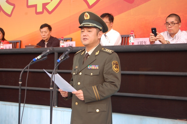 会上,武警江苏总队第二支队支队长任兵作了讲话。中文系崔万杰同学代表参训学生作了发言。