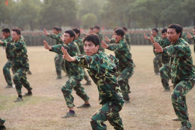 伴随着激昂的《解放军进行曲》,各军训方队在军训团团旗的引导下,迈着整齐的步伐一一经过主席台,接受与会领导和教官的检阅。同学们身着军服,精神饱满,步伐矫健,口号响亮,充分体现出我院新生青春洋溢的蓬勃朝气和报效祖国的壮志豪情。表演科目方队和施训教官进行了女子匕首操、女子防身术、男子应急棍、男子擒敌拳和摔擒技术表演,他们整齐划一的动作和刚劲有力的气势,赢得了在场领导和师生们的阵阵掌声。