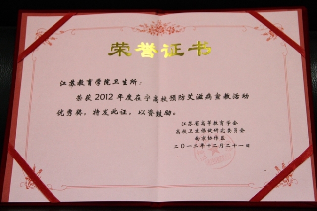 在1月11日举行的江苏省高校卫生保健研究会南京协作区2012年年会上,我院卫生所喜获在宁高校预防艾滋病宣教活动优秀奖。