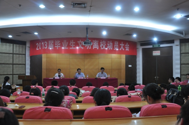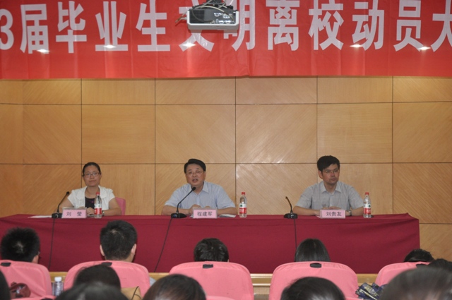 6月18日下午,我院在草场门校区报告厅举行2013届毕业生文明离校动员大会,党委副书记、副院长程建军,学工处、团委等部门负责同志及2013届毕业生团学干部代表一百余人参加大会。