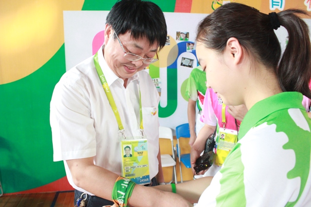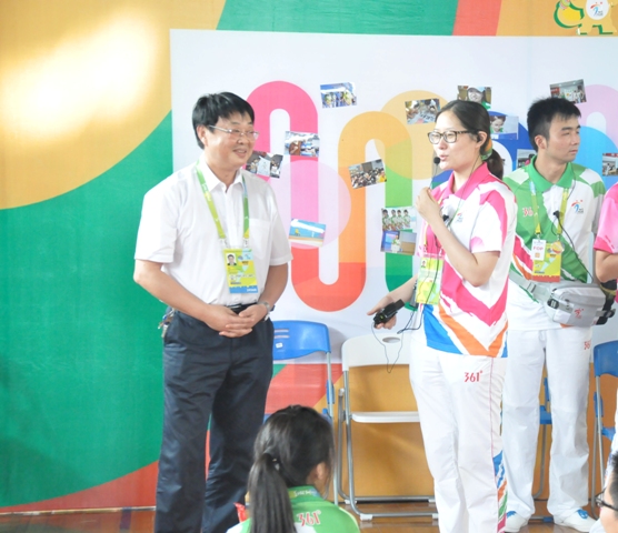 16:00,正值志愿者上下午班轮班之际,志愿者们集中在志愿者之家等待上岗,程书记走到志愿者中间,发表了热情洋溢的讲话,他赞扬大家在炎热的天气下坚持工作的志愿服务精神,表达了对于志愿者新学期学习生活的高度期许。亲切的话语让志愿者们士气高涨。中文系2011级顾梦苏同学代表所有志愿者向程书记赠送了象征志愿者“热情”的徽章,并为程书记系上志愿者“志愿彩”。 志愿者纷纷表示会以饱满的热情和青春的微笑圆满完成亚青会志愿服务任务。