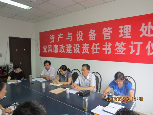 9月9日下午,资产与设备管理处举行党风廉政建设责任书签字仪式。院纪委书记刘青平,纪委副书记、纪监审办公室主任卜玉平出席仪式,副处长兼直属党支部书记李业正主持仪式。