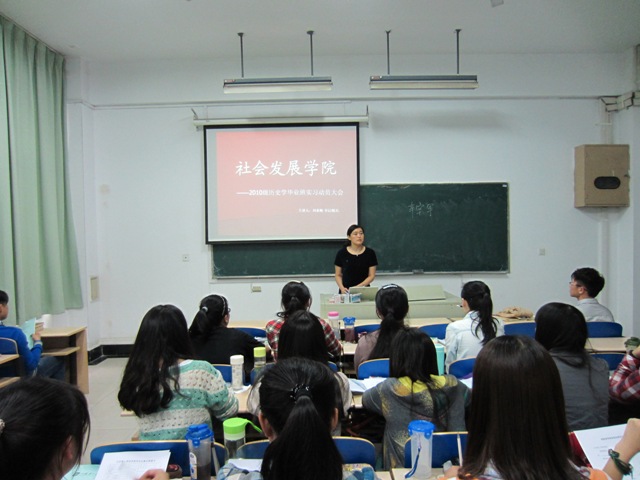 9月25日下午,社会发展学院在浦口校区教学楼111教室召开10级历史普本班实习动员大会,党总支书记、副院长刘素梅,梁励教授,学工办主任辛宪军以及10历史普本班班主任朱宇出席大会。