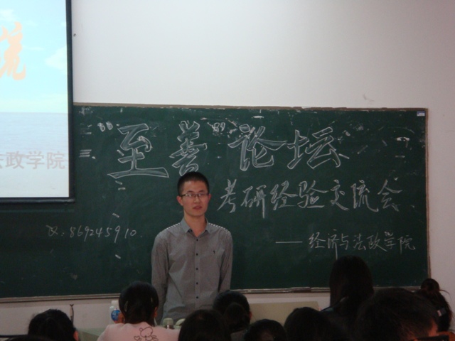 李安林宣布“至善论坛”启动。随后,09届思政专业的郝凤,09届工商管理的谢天添、李长春、仇鑫等四位同学分别上台,介绍了考研的基本事项以及各自的考研心得。