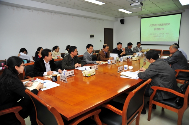 11月8日下午,2013年度国家社科基金项目《党员退出机制研究》开题会在草场门校区教科研楼503室举行。南京大学哲学系教授刘林元、省委组织部研究室主任洪浩、省委宣传部规划办主任尚庆飞应邀出席开题会。会议由项目主持人,院党委副书记、副院长程建军主持。课题组核心成员、院党委书记管向群,省广播电视总台纪委书记蒋宏宾,我院经法学院党总支书记李安林、南京邮电大学教师刘筱勤出席会议,宣传部部长王宵前、科研处处长徐国华列席会议。