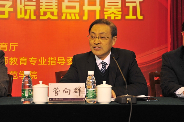 管向群代表江苏第二师范学院致欢迎辞。他首先对各位领导和全体参赛人员表示热烈的欢迎,接着简要介绍了江苏第二师范学院的发展历史以及在教师教育方面所取得的成就,同时通报了赛点的组织准备情况。最后,他表示江苏第二师范学院一定做好东道主,在前期精心组织准备的基础上,严守大赛组织规程,认真细致热情周到地做好比赛期间的各项组织和服务工作,确保比赛的公平、公正和有序进行。