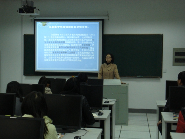 于老师介绍了义务教育后的地理课程的发展以及教师的教学情况。她说,义务教育地理课程改革总体目标包括学生的全面发展及终身发展、促进教师的专业发展(教学、学习方式)、学生要具备地理科学素养和人文素养。于老师提出教师的基本要求除了要提高学生的地理素养,还要培养做人和研究能力。
