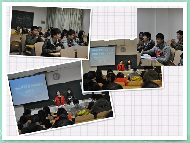 为响应2014年江苏省选聘高校在校毕业生到村任职通知,积极组织大学生到基层工作,3月24日,生命科学与化学化工学举行村官选聘政策宣讲会,邀请宜兴市官林镇官林村副书记、镇团委委员周玲来院主讲。
