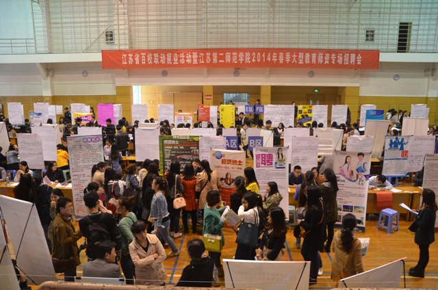 4月16日下午,招生就业处就业办在草场门校区体育馆内举办“江苏第二师范学院2014年春季大型教育师资专场招聘会”。院党委副书记、副院长程建军亲临现场指导,招就处全体人员及二级学院就业工作负责人、就业专员出席招聘会。