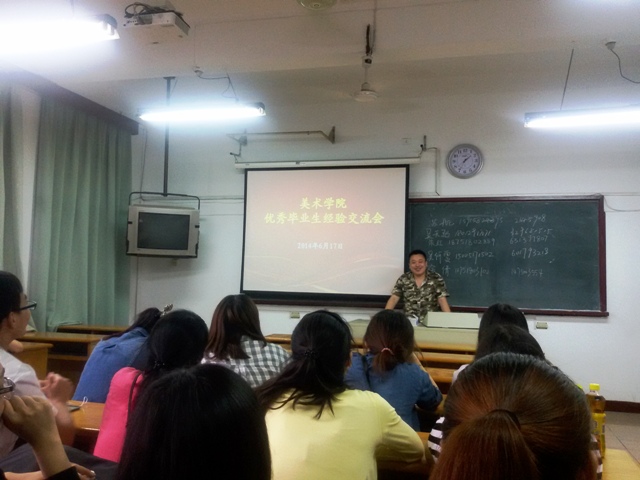 近日,美术学院在草场门校区教学楼309和312举行“2014届优秀毕业生经验交流会”,本科三年级和专科二年级全体学生参加会议。来自12美术转本班和11室内设计专科班的九位优秀毕业生给大家作了经验介绍。