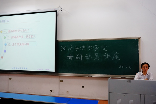 4月27日,经济与法政学院举办2015年春季经管类专业考研动员讲座,成谢军与张敏老师主讲,经法院12级工商管理和人力资源管理专业的全体学生聆听了报告。