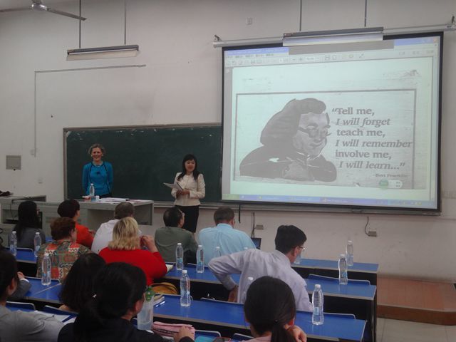 5月5日下午举行了“基于中国教育环境的以内容为依托的英语课程策略”的专题讲座,讲座专家为培生出版社资深教材编写专家、美国哥伦比亚大学 Frances A. Boyd 教授。Frances教授就语言交流技巧和批判性思维作了细致讲解,同学们都认真倾听并做好相关记录。讲座最后模拟了哥伦比亚大学上课时的情景,同学们踊跃参与,与教授进行了热烈而又精彩的互动。