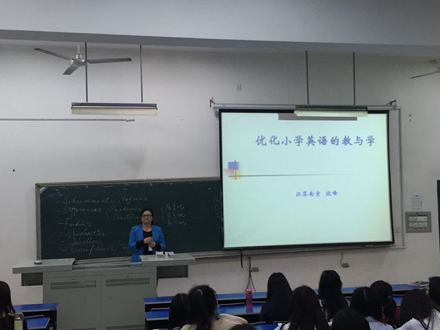 5月7日下午邀请全国教学名师沈峰老师给2016届毕业班学生举行了“优化小学英语的教与学”的学术讲座。沈老师结合自己的公开课,采用教学视频讲解与实例分析相结合的方法,化难为易,以其幽默的语言和丰富的教学经验向大家讲授了如何优化教学情境、设计课堂方案及如何因材施教等内容。