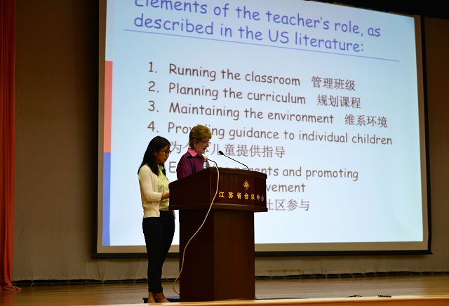 李洪天致欢迎词。他介绍我院的历史沿革与发展近况,并详细阐述我院主动适应江苏教育改革发展新形势,以建设高水平有特色的新型师范学院和全国一流的教育科研基地为目标,着力打造“学前教育”特色与品牌,不断提高办学水平和人才培养质量的情况。2014年我院学前教育学院获批成为“教育部卓越幼儿教师培养项目”,成为全国获批的20个幼儿师资类项目之一,此次学前教育国际研讨会的召开将为学前教育学院提供更为宽广的发展平台。