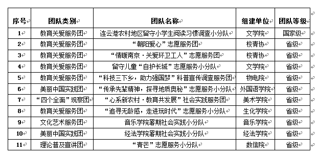 近日,在团省委下发的“关于公布2015年全省大中专学生志愿者暑期文化科技卫生“三下乡”社会实践活动全国及省级重点团队的通知”中,文学院组建的连云港农村地区留守小学生阅读习惯调查志愿服务团队被评为“2015江苏省暑期三下乡社会实践国家级重点团队”,校“蒲公英”青年志愿者协会组建的“情暖南京·关爱环卫工人”等10支志愿服务团队被评为“2015江苏省暑期三下乡社会实践省级重点团队”。