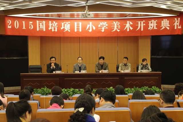 11月8日上午,我校在草场门校区现代教育技术楼二楼报告厅举行“国培计划(2015)”—安徽、山西乡村教师访名校活动小学美术班开班典礼。院长王仁雷、副院长周成平以及继续教育办公室主任章飞、美术学院党总支书记李铁英出席典礼,美术学院院长张广才主持典礼。
