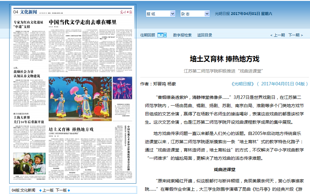 3月中旬,《光明日报》《中国教育报》先后带来我院继续调研教育教学与校园文化建设。4月1日,《光明日报》04版以“培土又育林 捧热地方戏”为题,刊发我院在弘扬与传承富有江苏地方特色的传统戏曲文化方面的实际功效。我院“戏曲进校园”是将地方传统戏曲、音乐与音乐专业建设相结合,将地方传统戏曲、音乐教育与校园文化建设相结合,将地方传统戏曲、音乐的挖掘、传承与社会普及教育相结合。这既是对区域文化和历史传承的重要方式,也是构建多维度、多平台的特色校园文化,传播特色校园思想的有益尝试。
