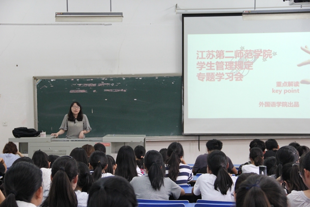 9月19日中午,外国语学院组织2016级普本班学生学习相关管理规定,院党总支副书记黄晓波出席。会上,学工办张婧老师重点从学习、生活和考试诚信等三个方面就新修订的学生管理规定有关内容对同学进行了解读,特别强调了管理规定中最新的几点变化,教育同学们在学期间严格遵守学生管理规定。路伟华老师就学生人身安全、财产安全、社交安全和心理健康等四个方面进行了安全教育,并部署了安全卫生大检查的有关工作。黄晓波作总结,就学生管理规定、安全问题等一些重点方面作了进一步强调,并就2016级普本班学生今后的专业学习、教师资格证考试、考研就业等方面提出了有关要求;他提议学工办结合学生专业成长档案为每一位创建学生电子成长档案,便于同学们能总结、反思以往一年的大学生活,设定好二、三年级的目标,规划好自己的未来。