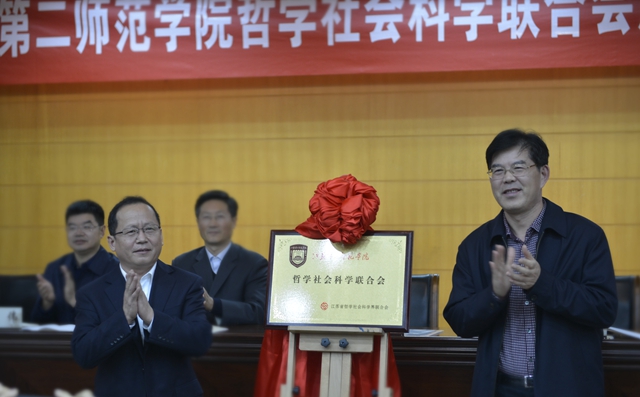 潘文宣读校党委《关于同意成立江苏第二师范学院哲学社会科学联合会并召开第一次代表大会的批复》,徐之顺宣读省社科联《关于同意接纳江苏第二师范学院社科联为团体会员的批复》,王永贵代表兄弟院校致贺词,刘德海、王仁雷共同为校社科联成立揭牌。