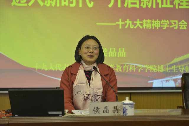 侯晶晶从“十九大主题、主要成果及报告结构”、“报告主要内容”、“报告新观点、新思想”、“学习十九大的‘七个讲清楚’”、“我所经历的十九大”五个方面作了宣讲,重点解读了十九大报告中的新观点、新思想、新要求。侯晶晶说,我们伟大的党,不忘初心再出发,勇担重任立潮头,引领承载中国人民伟大梦想的航船破浪前进,驶向更加光辉的彼岸。侯晶晶指出,站在中国特色社会主义进入新时代的新起点上,高校应该以十九大报告为指引,坚持立德树人,培育青少年树立远大理想,践行社会主义核心价值观,为实现“两个一百年”奋斗目标和中华民族伟大复兴中国梦提供人才保障。