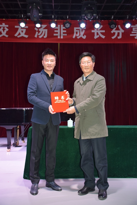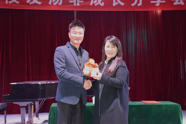 刘继红代表学校接受汤非赠送的音乐作品,王建为汤非颁发客座教授聘书。汤非与现场师生共同分享了自己的成长经历,对母校的悉心培养表示深深的感谢,对学弟学妹的成长给予深情的勉励。