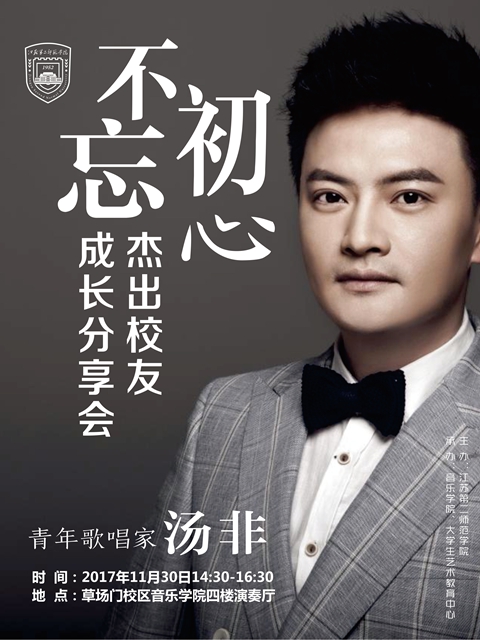 11月30日下午,我校在草场门校区演奏厅举行“不忘初心——杰出校友成长分享会”,校友、青年歌唱家汤非与师生分享了他的成长故事,校长王建、副校长刘继红及师生代表200余人参加活动。