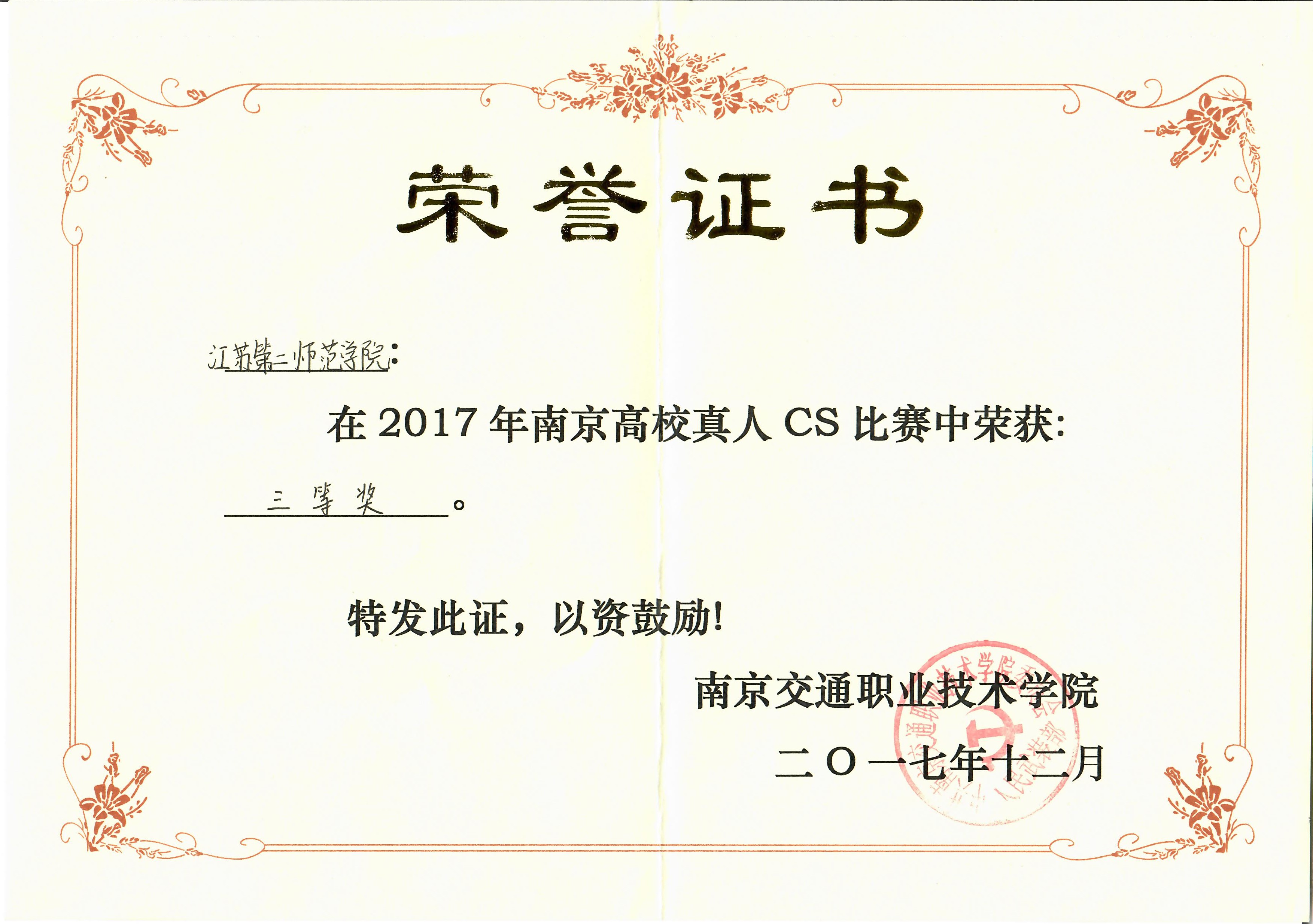 12月2日,由南京交通职业技术学院主办,10所在宁高校共同参与的南京高校真人CS联赛在中山陵滑道游乐园举行,我校国防协会会员及军事爱好者组成的代表队在此次活动中获得三等奖。
