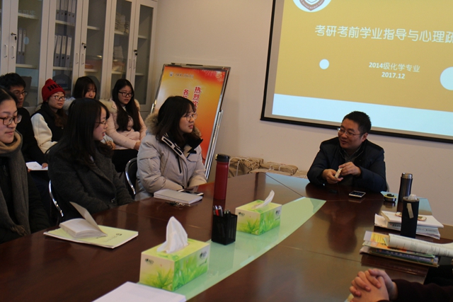 12月19日,生化学院召开了两场学生考研考前学业指导与心理疏导座谈会,会议分别由副院长花书贵和党总支书记陈建琴主持。14生物师范班第二班主任、副校长徐国华,该院院长蒋功成、副院长朱学伸出席会议,相关课程指导教师、辅导员和即将参加2017年考研的50余名14级化学专业、生物科学专业同学参加会议。