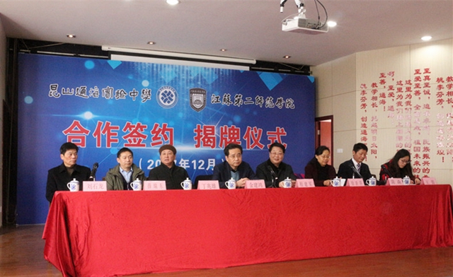 12月23日下午,我校与昆山通海实验中学举行实习实训基地签约授牌仪式。昆山教育局局长金建鸿、昆山通海实验中学董事长陈森等,我校原党委副书记、副院长程建军,教务处处长徐新萍、副处长薛瑞东等参加此次活动。