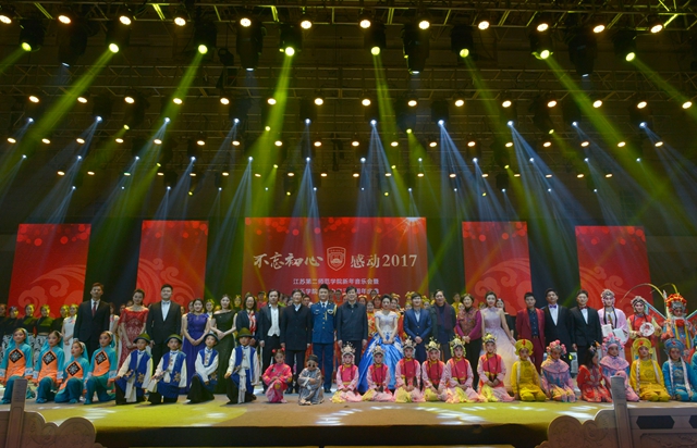 12月26日晚,我校在草场门校区体育馆隆重举行“不忘初心,感动2017”新年音乐会暨音乐学院专业办学三十周年庆典。中国合唱协会副理事长、中国高校合唱委员会主席任宝平,江苏省教育厅艺术指导委员会秘书长刘扬生,中央电视台戏曲频道导演姜芳,我校党委书记王仁雷,校长王建,校领导张勤、刘继红、祝兴成、潘文、姚振标、徐国华出席晚会,与各位嘉宾、师生代表欢聚一堂,共贺新年。