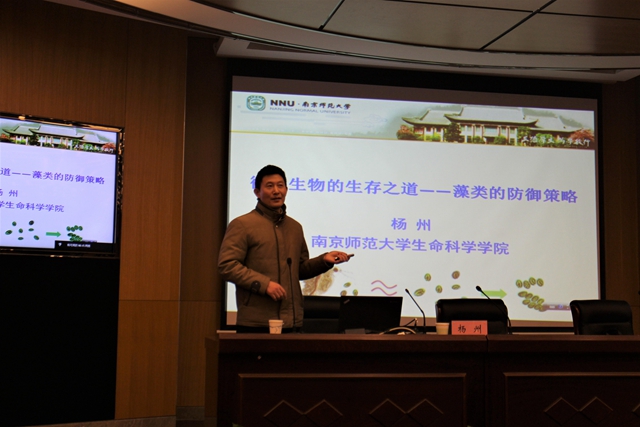 1月10日下午,生化学院水生生物研究所邀请南京师范大学生命科学学院杨州教授来我校,在草场门校区技术楼二楼报告厅作了一场题为《微小生物的生存之道--藻类的防御策略》的学术报告。生化学院院长蒋功成、党总支书记陈建琴出席,副院长朱学伸主持讲座,该院150余名师生参加学术讲座。
