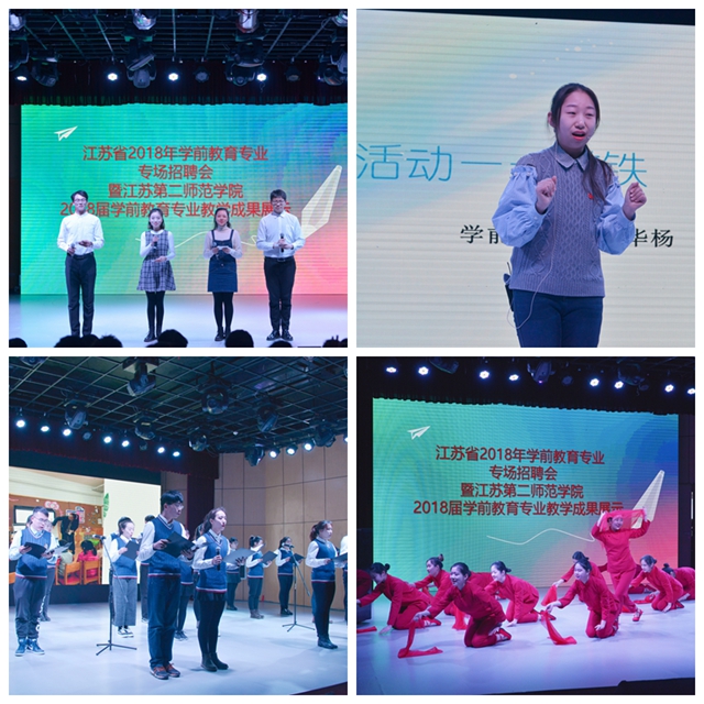 此次展示活动为综合专业技能汇报展演和美术作品展览。汇报演出节目形式丰富多样,内容精彩纷呈,有在省大学生艺术展演中获得特等奖的小合唱《九儿》、荣获一等奖的舞蹈《淮水情》;有在省师范生技能大赛中荣获一等奖的说课、二等奖的故事表演;有荣获2017年共青团中央优秀实践团队、江苏省暑期社会实践“十佳团队”的“彩虹伞—关爱农村儿童、倾心文化传递”服务团队活动展示等。节目秉承“薪火相传,琢卓其华”的培养特色,充分展示了我校学前教育专业的各项专业技能及社会服务情怀。现场气氛热烈,掌声雷动。演出获得用人单位的一致好评。