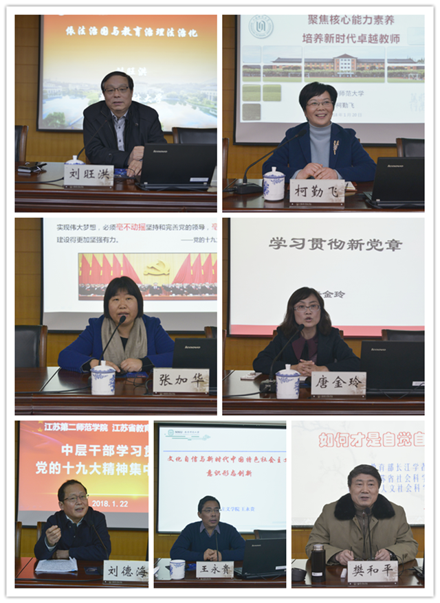 在为期5天的集中轮训中,先后邀请了7名省内外专家教授作辅导报告,规格之高、规模之大、时间之长,前所未有。南京审计大学校长、江苏省政协委员刘旺洪教授围绕依法治国与教育治理法治化;上海师范大学副校长柯勤飞教授围绕新时代的高等师范教育;江苏省委党校张加华教授围绕全面从严治党;江苏省委党校唐金玲教授围绕新党章;江苏省社科联党组书记、常务副主席刘德海围绕习近平新时代中国特色社会主义思想;南京师范大学王永贵教授围绕新时代主要矛盾的变化;江苏社会科学院副院长,东南大学特聘教授樊和平围绕文化如何才是自觉自信等主题先后作专题报告。在轮训内容上,紧紧围绕学习贯彻党的十九大精神这个主题,牢牢把握习近平新时代中国特色社会主义思想这个灵魂和主线,突出党的十九大报告、《中国共产党章程》的学习,也结合院情实际,把新时代的高等师范教育作为学习的重要内容。在培训方式上,坚持问题导向,引导参训学员带着问题学习、带着不足思考,要求每名学员联系实际谈认识,撰写心得体会,不断提高在新时代解决问题、推动发展的能力。