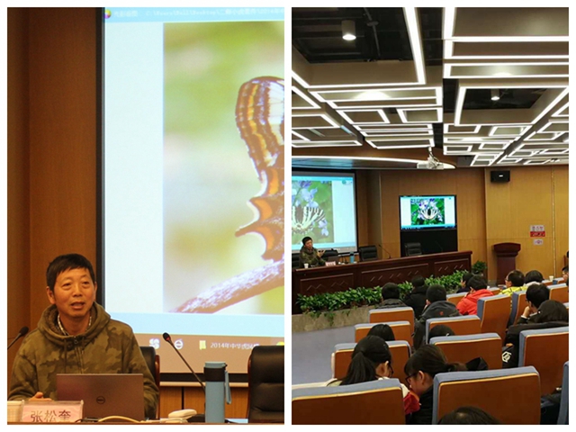 为了配合本次调查活动,3月7日下午,协会邀请南京中华虎凤蝶自然博物馆馆长、浦口区中华虎凤蝶保护协会会长张松奎来校作了一场“南京蝴蝶欣赏”专场科普讲座,并对本次“中华虎凤蝶全虫态研究和同步调查”进行了指导。生化学院部分专业教师和热爱环保的同学也一同参加了讲座。