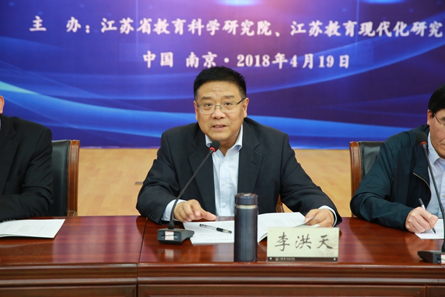 李洪天致欢迎辞。王晓天代表课题组从历史背景、时代使命、前期调研及课题分工安排等方面,详细介绍了规划研制情况。部分课题组成员分别汇报了各自所承担的子课题的研究情况。江苏省教育科学规划办主任彭钢从前期工作与学术版定位、战略背景与战略定位、战略目标与发展指标和总报告的基本框架等四个方面,汇报了《江苏教育现代化2035规划》(学术版)的研制情况。南京大学教育研究院宗晓华副教授从受教育水平、教育机会、教育投入、教育过程与教育产出等五个方面,比较分析了江苏与发达国家及其他省市教育现代化相关指标。南京师范大学李学农教授从2010-2020阶段江苏教师队伍建设目标及可实现度、新时代国家及江苏经济社会发展和教育现代化发展对江苏教师队伍建设的要求、2035江苏教师队伍建设目标选择等三个方面,介绍了《2035江苏高水平教师队伍建设研究》的总体思路。江苏省教育科学研究院高教所所长宋旭峰从新时代江苏经济社会发展对高等教育提出的新要求、江苏高等教育发展面临的主要矛盾和问题、江苏高等教育与国内外先进水平的差距等三个方面,分析了江苏高水平教育现代化(2035)高教目标的研制依据;并对相关目标进行了系统阐释。