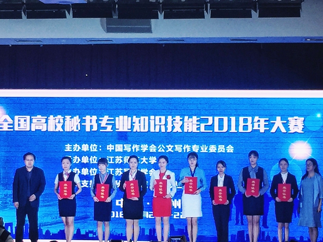 4月20日至22日,全国高校秘书专业知识技能2018年大赛在徐州举办。我校在该比赛中再获佳绩。文学院秘书学专业2015级学生徐荣、王亚磊与2016级学生谢菲、陆琪组成的我校代表队在大赛中荣获团体二等奖。徐荣同学荣获基础知识二等奖、硬笔书法一等奖、职业形象与素养展示二等奖,王亚磊同学荣获基础知识二等奖、硬笔书法一等奖,谢菲同学荣获硬笔书法二等奖,陆琪同学荣获职业形象与素养展示一等奖。四位参赛同学展示出了我校学子的风采。这也是继2017年首届全国高校秘书专业知识技能大赛后我校代表队再获佳绩。
