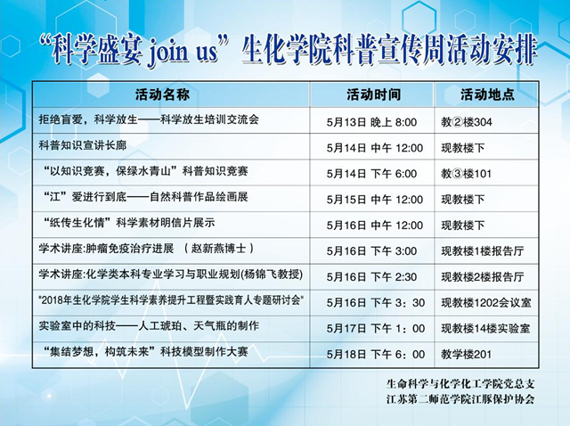 本次研讨会是生化学院第一届“科学盛宴 Join us”科普宣传周系列活动之一。本次科普宣传周主体活动包括科普展览、科学竞赛、科技制作、专家讲座、主题研讨等。活动旨在进一步普及科学知识,加强学生社团育人功能。