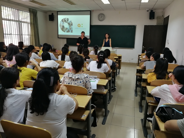 来宾参观了美术学院和平表情符号的展览,观摩了张广才教授的中国工笔人物画的课,还向草场门校区的学生进行了宣讲。