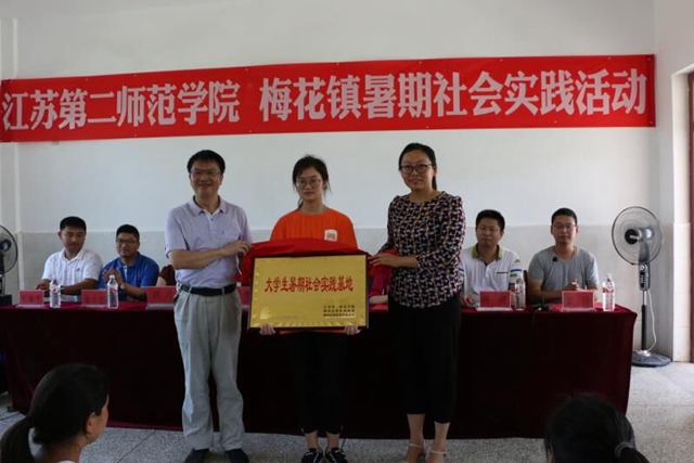 高英杰和秦振华共同为江苏第二师范学院梅花镇大学生暑期社会实践基地揭牌。