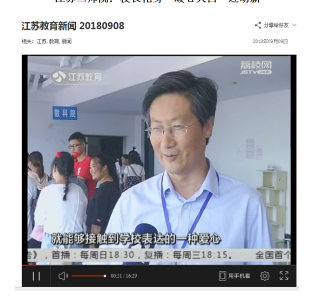 江苏教育频道报道的江苏二师院:校长化身“暖心大白”迎萌新获得11万+点击量,在当天的江苏广电融媒体报道中阅读量排名第四。
