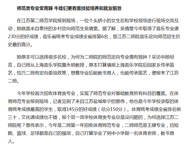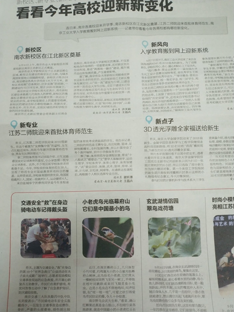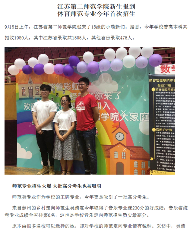 近日,多家主流媒体报道了我校9月8日开学迎新盛况。江苏教育频道、南京教育频道等电视媒体通过视听影像展现了我校迎新活动的特色与活力;现代快报、南京晨报、金陵晚报、扬子晚报、中国江苏网等多家媒体从“我校体育师范首次招生,实现师范专业全科覆盖”、“音乐定向师范高分考生钟情师范,毕业后回家乡传承笛艺”、“师范专业受青睐,牛娃们看中技能培养和就业前景”、“特色迎新:校长化身暖心大白迎萌新”、“数字迎新:玩转趣味大数据和互联网+,新生入学更加便捷。”这些角度来多方位全方面展示我校教育创新理念与迎新工作的出色成绩:南京晨报重点报道了我校今年新开的体育师范专业,该专业男女比例为7:1,与我校超过80%女生的情况有一定的反转;现代快报对我校乡村定向音乐专业高分考生吴倩雯做了专访;扬子晚报报道了我校趣味大数据系统的运用,包括新生生源地域分布,帮助新生找老乡、各专业男女比例情况、个人生活习惯宿舍分配情况。