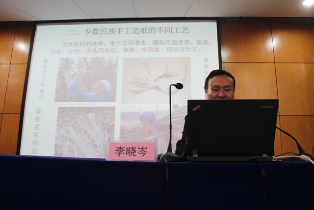 “以纸之名,追溯历史”,李晓岑教授以中国早期造纸史起源研究中纸的发明问题切入,围绕“蔡伦是造纸术的发明人吗?”这一疑问,向大家展示了他历经辛苦,寻觅多年才获得的不同历史阶段的纸文物图片,并且声情并茂地为大家讲解了这些纸的特点以及历史背景,令人耳目一新。